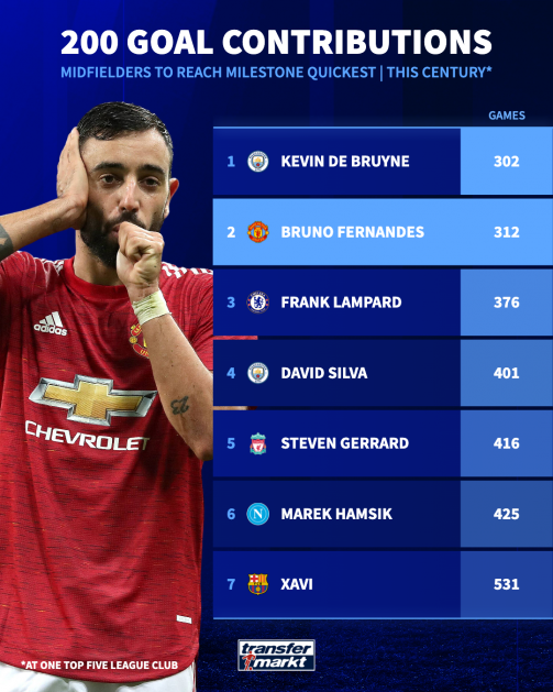 在本世纪五大联赛、单一俱乐部效力的球员中,B费是第31快达到200次进球参与的球员。