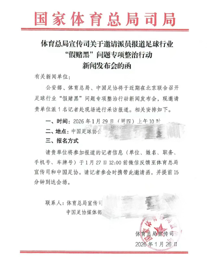 北京时间1月28日,来自多位媒体人透露,足球行业“假赌黑”专项整治行动的相关会议,将于29日上午10点在北京召开。