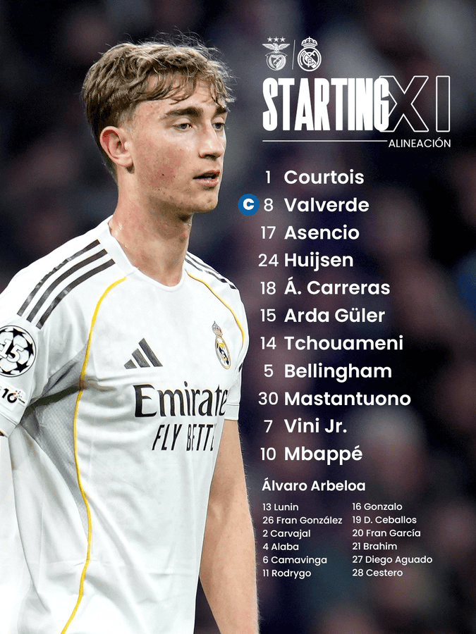 虎扑01月29日讯 欧冠联赛阶段末轮,皇马客战本菲卡,赛前,双方公布了本场比赛首发名单。