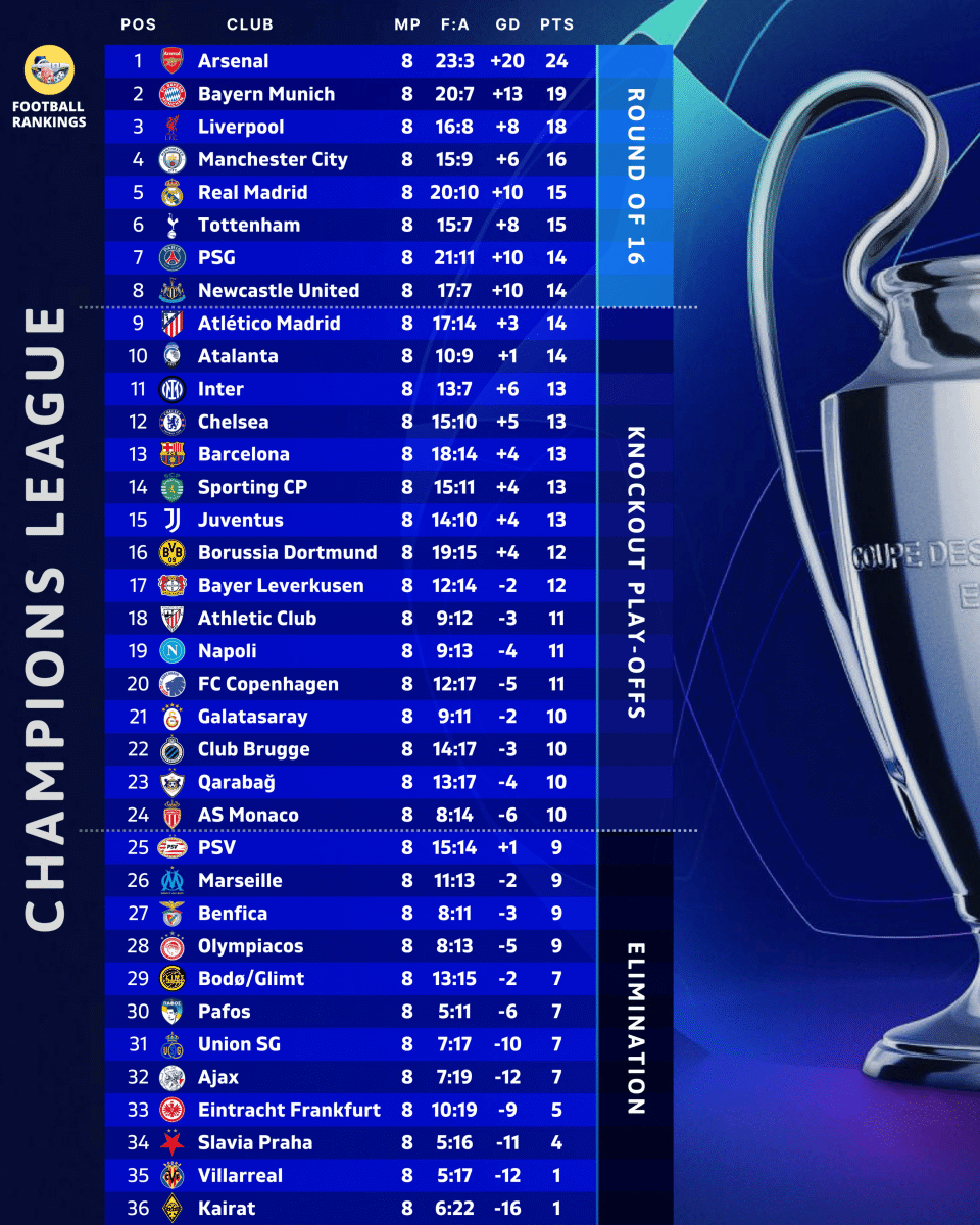 在即时积分榜上,巴黎和纽卡目前都在前八位,切尔西和巴塞罗那则排在前八之外。