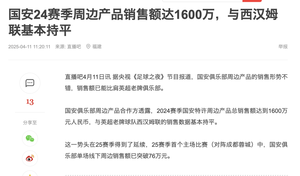 2025年足球之夜曾经报道过2024年北京国安周边产品销售达到英超西汉姆联的水平,考虑到同为首都圈,西汉姆联是英超中下游球队,北京国安是中超老牌劲旅,这个是有极大提升空间。实际上北京国安应该对标阿森纳和切尔西,而并非西汉姆联,但是我们仍然看到,如果中超俱乐部认真去搞俱乐部周边产品和球衣销售,中超俱乐部是可以赚钱的,甚至是一笔不小的收益。