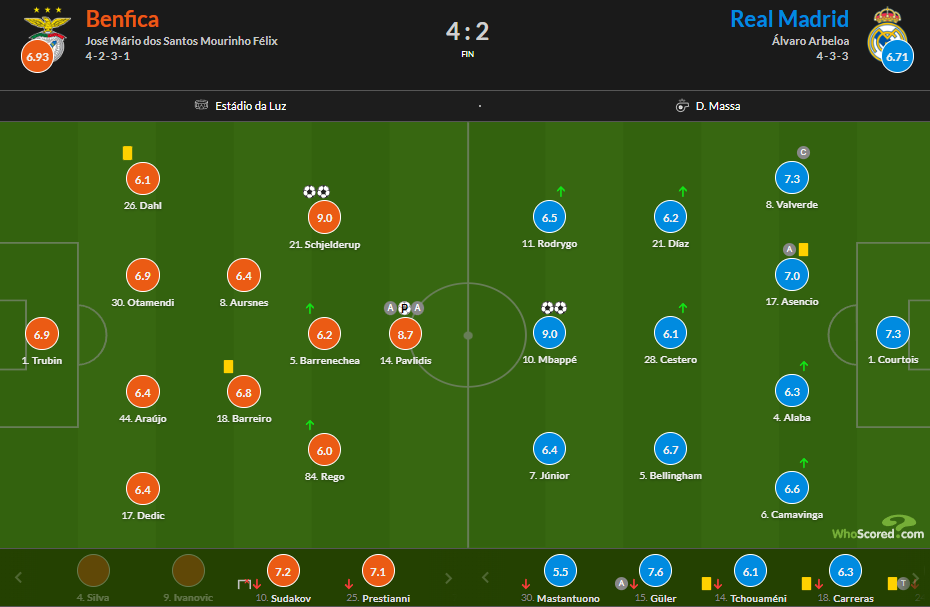 本菲卡首发:1-特鲁宾、17-德迪奇、44-阿劳若、30-奥塔门迪、26-达尔、18-巴雷罗、8-奥尔斯内斯、25-普雷斯蒂安尼、10-苏达科夫、21-谢尔德鲁普、14-帕夫利季斯