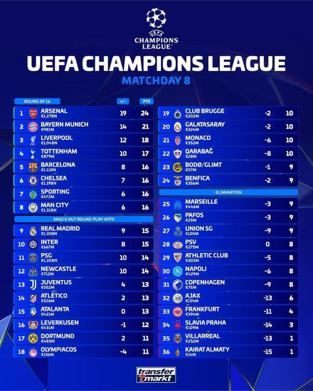 直通16强球队(1-8名):阿森纳、拜仁慕尼黑、利物浦、托特纳姆热刺、巴塞罗那、切尔西、里斯本竞技、曼城