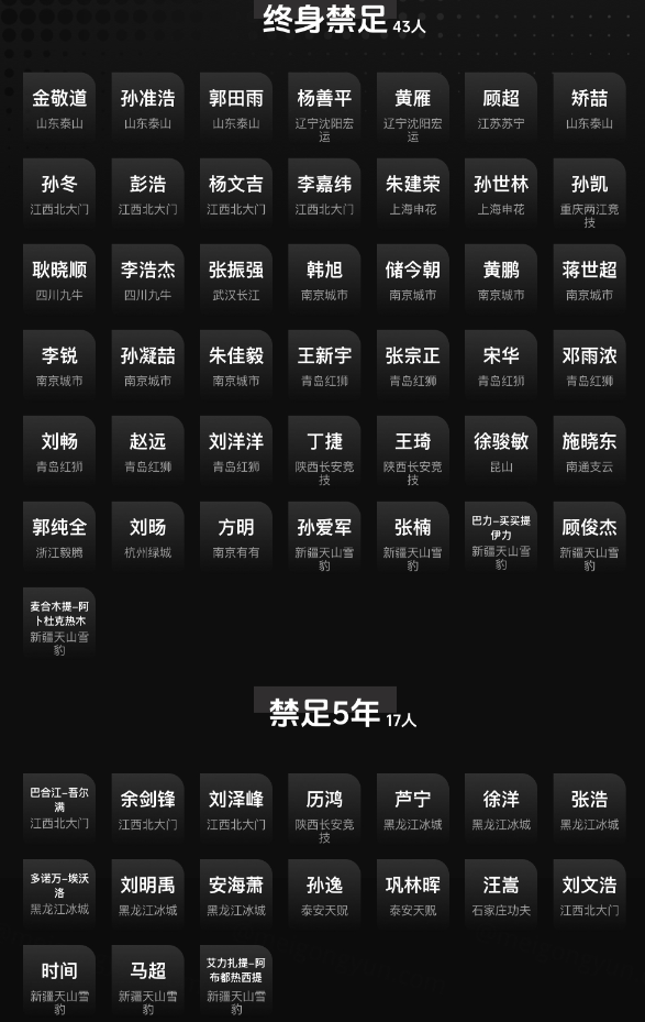 随后,足协首次公布处罚名单,包括金敬道、孙准浩、郭田雨、矫喆、朱建荣、孙士林在内的43人被终身禁足,包括汪嵩在内的17人被禁足5年。