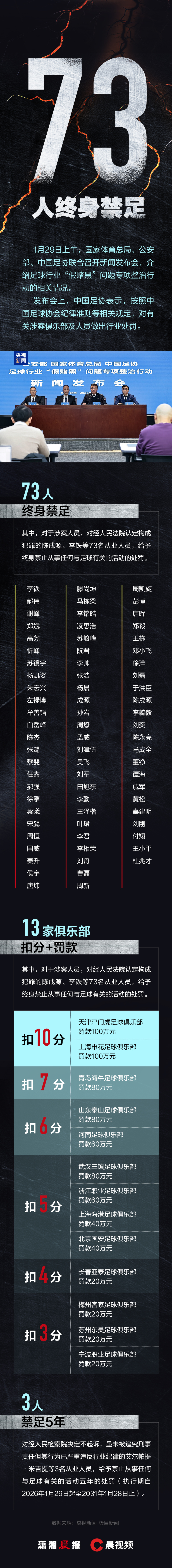 中国足协公布纪律处罚决定:73人被终身禁止从事任何与足球有关的活动,多人及多家俱乐部受到相应处罚。我们梳理核心信息与完整名单,不是为“围观”而列名,而是让规则被看见、让代价被记住——唯有把底线立住,足球的信任才有机会重建。