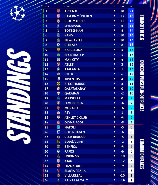 北京时间1月29日凌晨,欧冠联赛末轮结束了所有的18场比赛,阿森纳曼城切尔西在内的5支英超球队占据前八的5个位置昂首出线。而原本占据积分榜前三的皇马却在最后一轮输给了本菲卡掉出了晋级区,而击败银河战舰的恰恰是他们的老熟人:穆里尼奥。此外穆帅带队逆袭,开局4连败的本菲卡以第24名晋级欧冠附加赛。