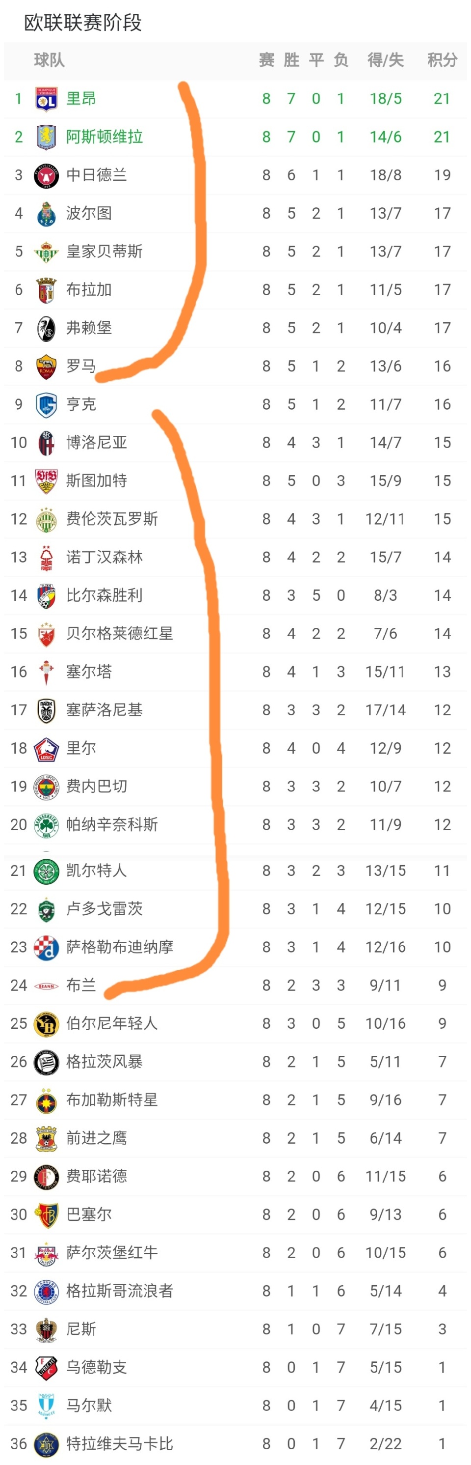 可以看到里昂、维拉、中日德兰、波尔图、贝蒂斯、布拉加、弗赖堡、罗马直通了欧联16强,而第9到第24的球队获得了欧联杯淘汰赛附加赛的席位,其余球队出局。我们可以看到费耶诺德、格拉斯哥流浪者、尼斯这样的强队都已经出局,费内巴切、诺丁汉森林、博洛尼亚、斯图加特、里尔、塞尔塔这些强队要踢附加赛。