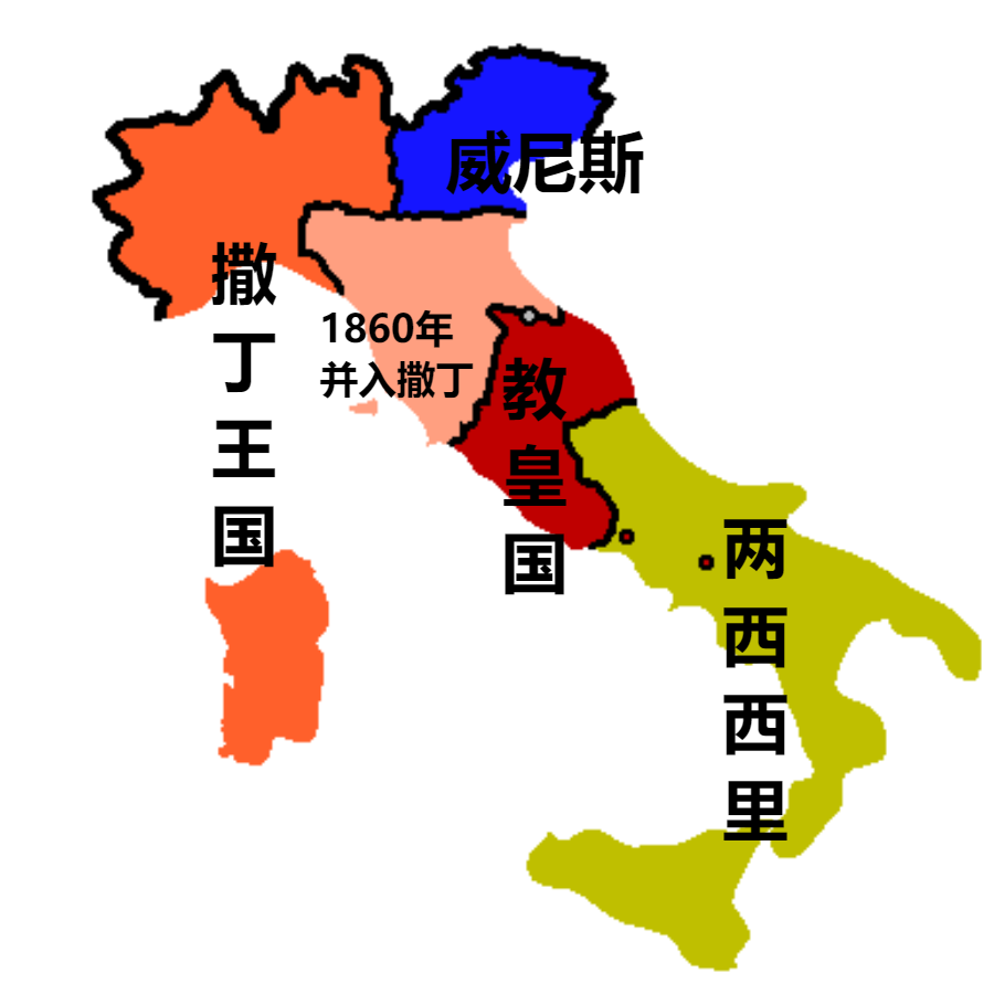 1860年,在法国的帮助下,撒丁王国将除了东北部威尼斯之外的北方地区全部统一。