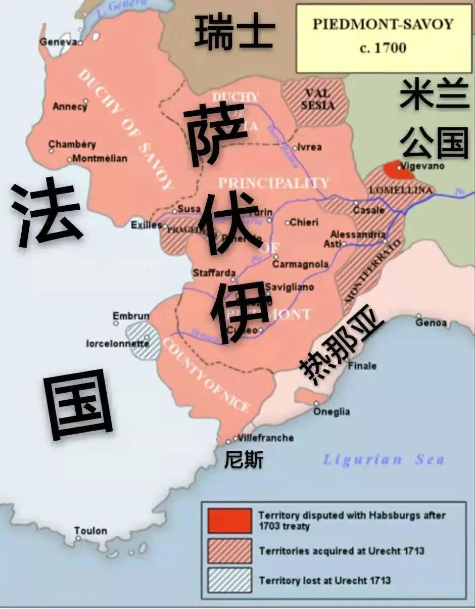 18世纪时期,萨伏伊公国利用西班牙王位继承战争中站队英、奥一方。站对了队的萨伏伊王国获得了英、奥的奖励,不仅将尼斯掌握在自己手里,合并了撒丁岛。国家从公国升格为萨伏伊-撒丁王国。简称撒丁王国。