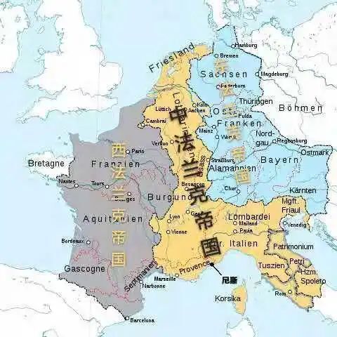 公元843年,法兰克王国被查理曼大帝的三个孙子瓜分,成为了东西中三个法兰克王国。
