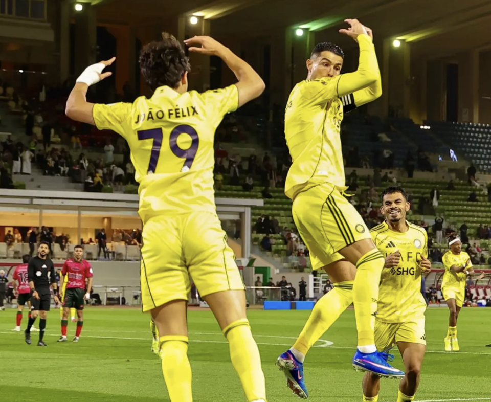 上半场,两队0-0战平。下半场刚开始,C罗就为球队首开记录。第47分钟,利雅得胜利三巨头联手制造进球:马内直塞,菲利克斯得球后横传,C罗包抄,轻松推射得手!进球后,C罗做出标志性的siu庆祝动作。