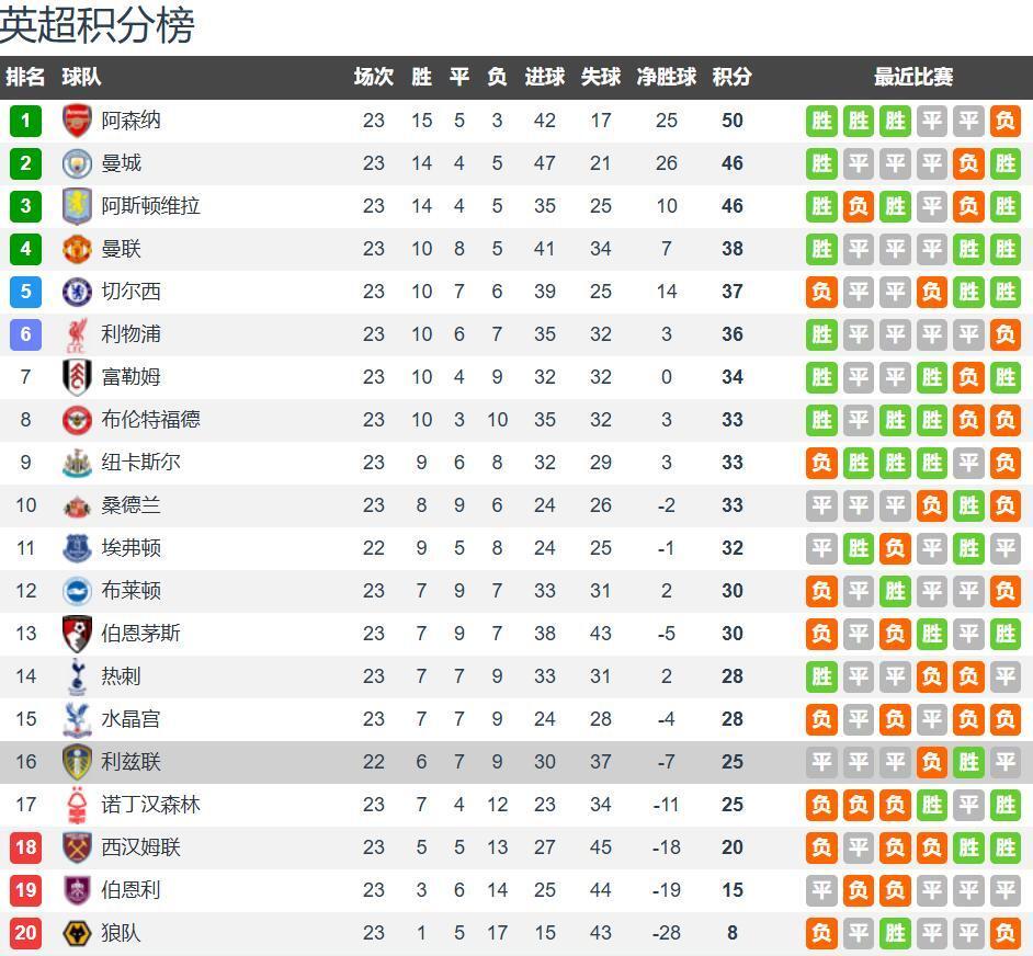 第一:两队情况!英超23轮战罢,利兹联6胜7平9负积25分排名第十六,领先降级区5分;阿森纳15胜5平3负积50分排名第一,4分优势领跑。上轮英超,利兹联客场1-1战平埃弗顿,近10轮仅有1胜;阿森纳主场2-3不敌曼联,各项赛事12连胜被终结,周中欧冠主场3-2击败阿拉木图凯拉特。