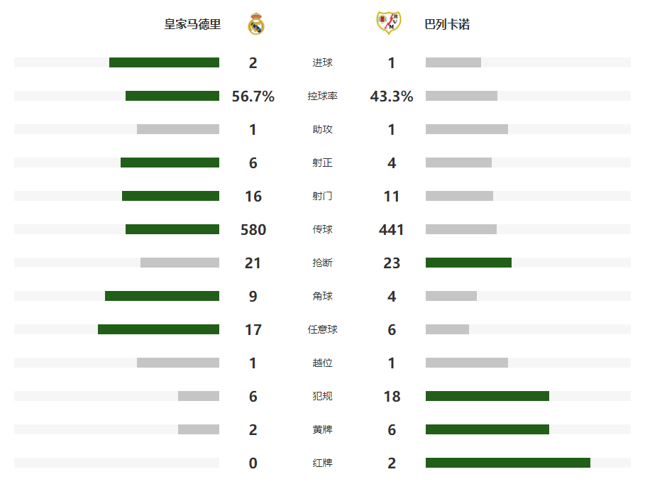 北京时间2月1日晚,西甲第22轮中,皇马主场2-1险胜巴列卡诺,联赛6连胜,落后巴萨1分。维尼修斯个人突破兜射破门,德弗鲁托斯扳平比分,姆巴佩99分钟主罚点球命中,西斯与查瓦里亚被红牌罚下,姆巴佩与卡马文加击中门框,贝林厄姆伤退。