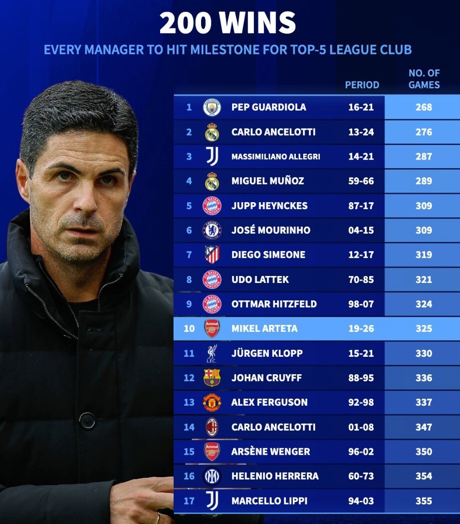 北京时间1月31日,德转列出了执教单一欧洲五大联赛俱乐部达成过200胜里程碑的主教练,阿尔特塔以325战取胜200场位列达成这一里程碑第10快的主教练,而瓜迪奥拉则以268战取胜200场排名第一。