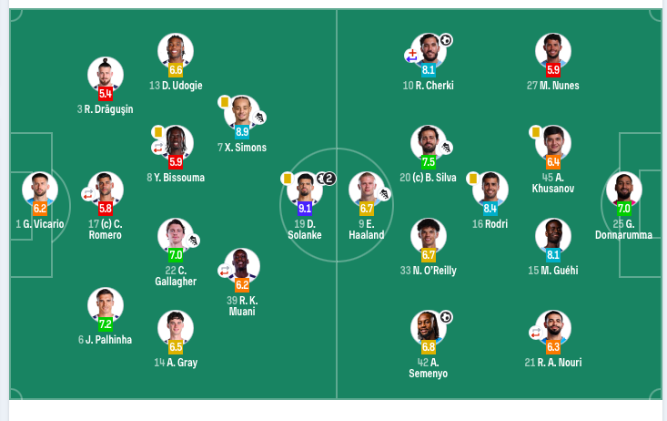曼城首发:25-多纳鲁马、27-努内斯、45-胡桑诺夫、15-格伊、21-艾特-努里(68’14-尼科·冈萨雷斯)、16-罗德里(94’7-马尔穆什)、20-B席(88’47-福登)、33-奥赖利、42-塞梅尼奥、10-谢尔基(68’4-赖因德斯)、9-哈兰德。