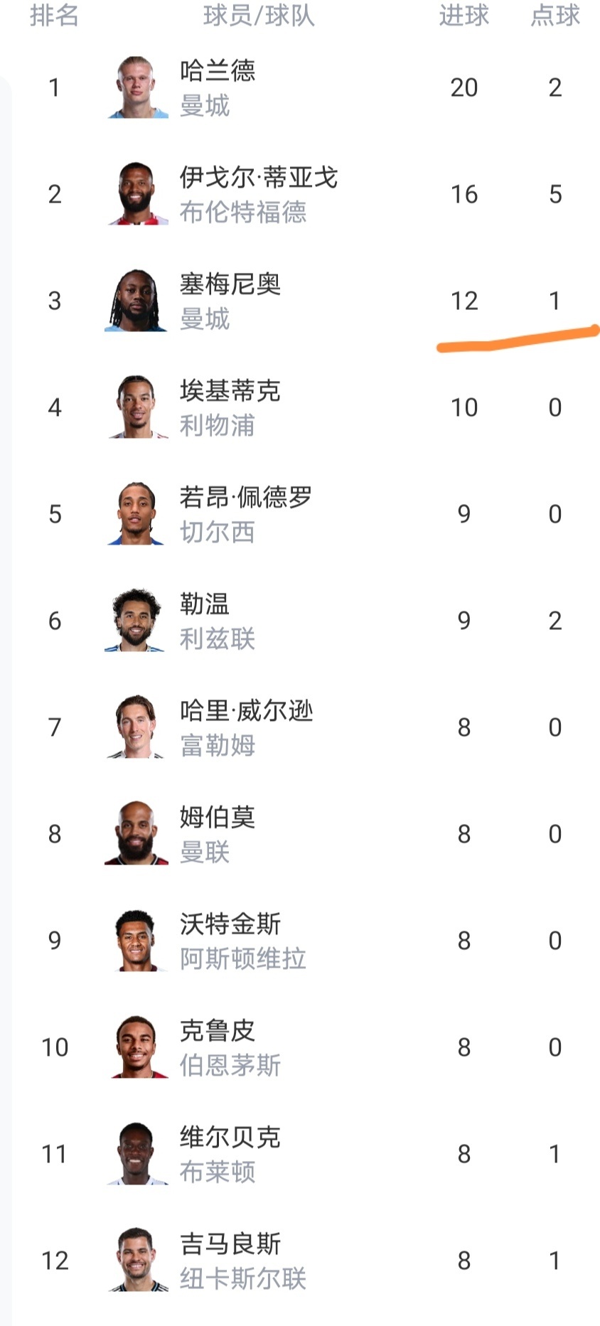 射手榜塞梅尼奥已经打入12球了,四人进球都是上双的,哈兰德继续领跑。