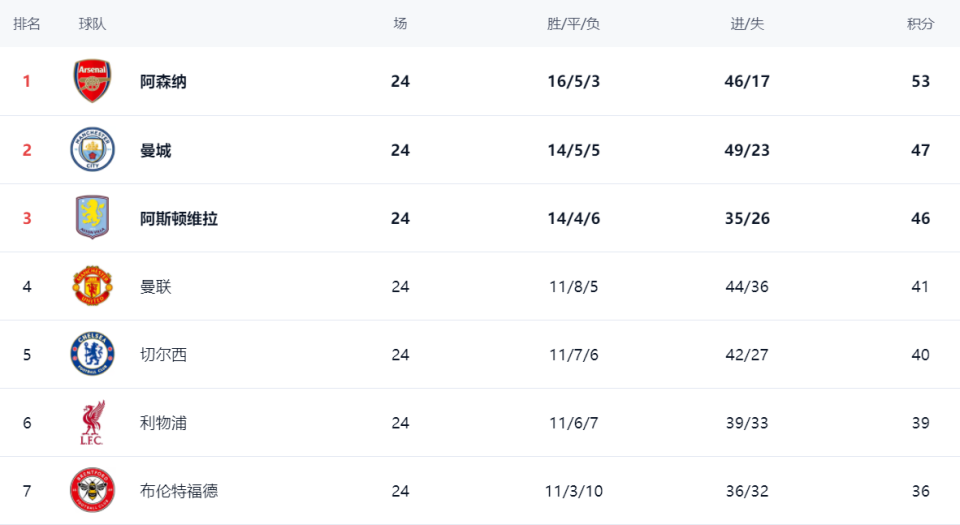 在积分榜上,阿森纳依然高居榜首,拿到53分。阿森纳的两大争冠劲敌曼城和维拉都丢分了。曼城总积分是47分,落后6分,排名第2。而阿斯顿维拉依然是46分,排名第3。曼联杀入欧冠区,总积分41分,排名第4。切尔西以40分排名第5。利物浦只拿到39分,掉到了第6的位置。