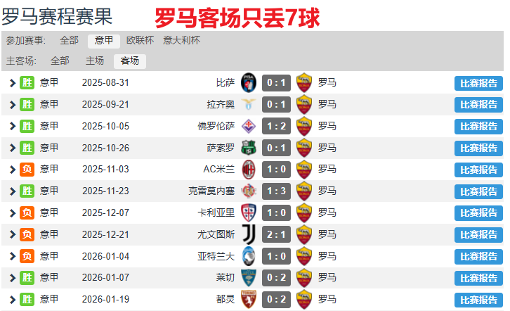 主理人直接上数据。罗马本赛季在客场的防守表现是现象级的。在前11个意甲客场比赛中,罗马仅仅丢了7个球。