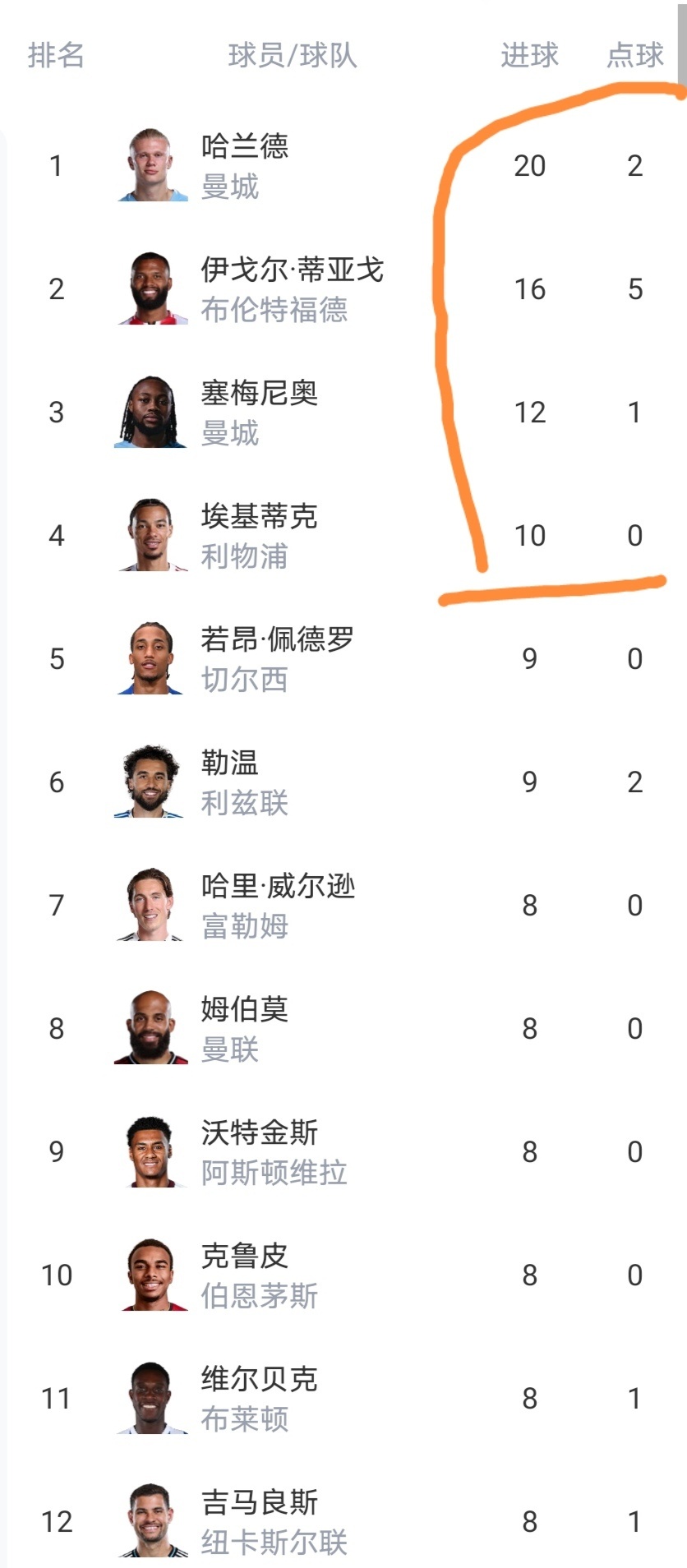 射手榜上可以看到蒂亚戈、塞梅尼奥、埃基蒂克拼命追赶哈兰德。