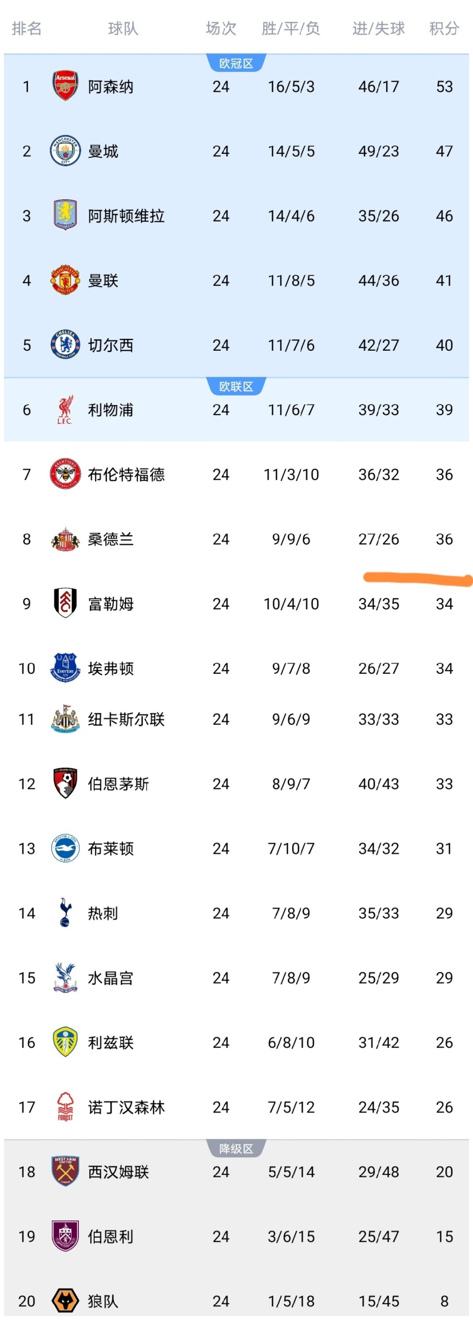 今天凌晨,英超第24轮结束了最后一场的较量,桑德兰、伯恩利出战,这场较量之后,英超所有球队都已经踢完了第24轮的比赛,英超积分榜随之发生变化,我们来看看。