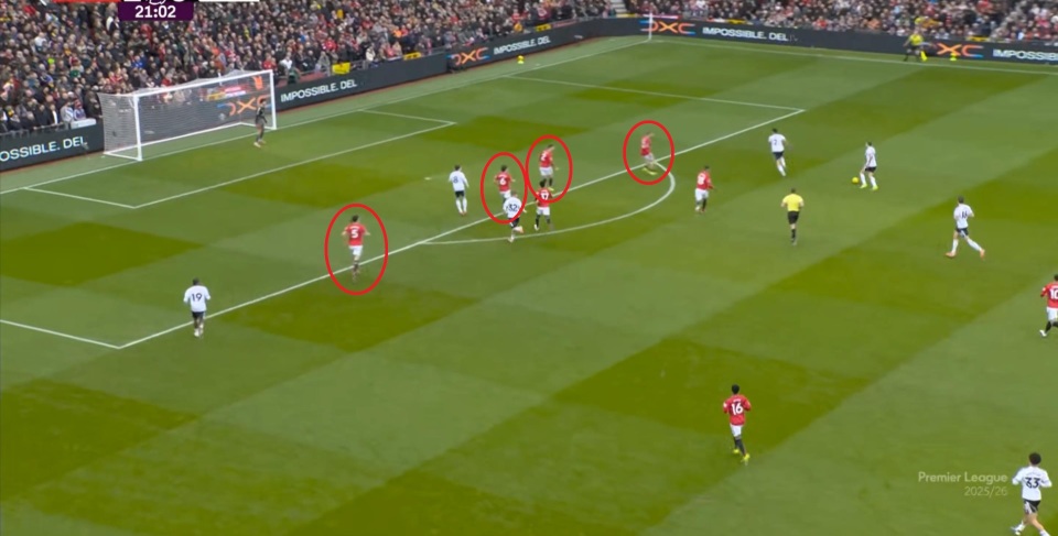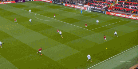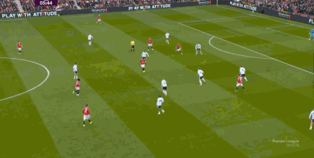 就是在这次进攻的早期阶段,曼联在场上呈现出了一个神奇的模样,那就是在富勒姆的四后卫身侧,一个曼联的球员都没有,大部分进攻手都聚在右侧打小球:
