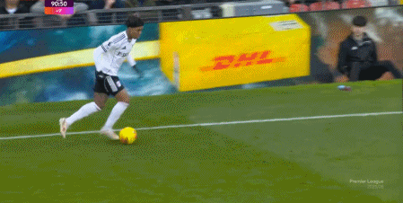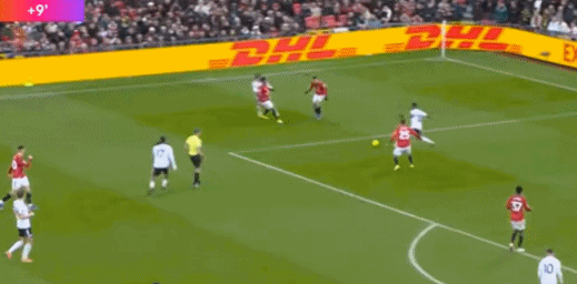 比如在出球阶段,富勒姆会直接寻找希门尼斯这个典型的中锋球员,从而破开曼联的逼抢,再从边路完成推进: