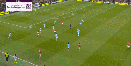 因为在凯文接球的时候,阿玛德-迪亚洛其实是跟着边后卫塞塞尼翁来到肋部的,这个时候的马奎尔的位置也是对的: