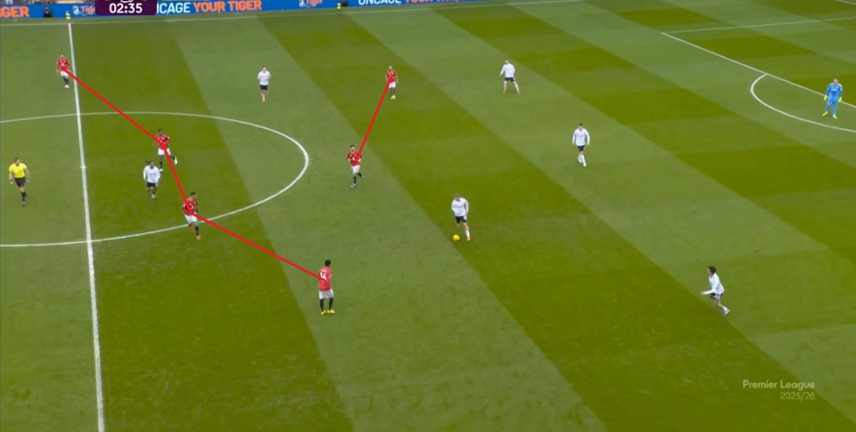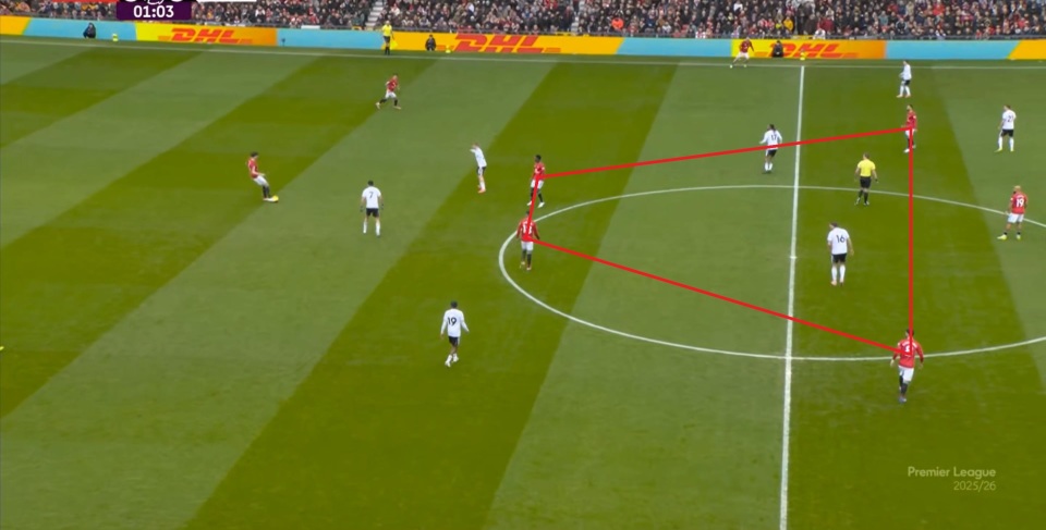 从这个角度来说,库尼亚的防守职责反而比阿玛德-迪亚洛还要重,你可以借此认为库尼亚依旧在执行多尔古的场上职责,但在有球环节,曼联的变化会稍大一些。