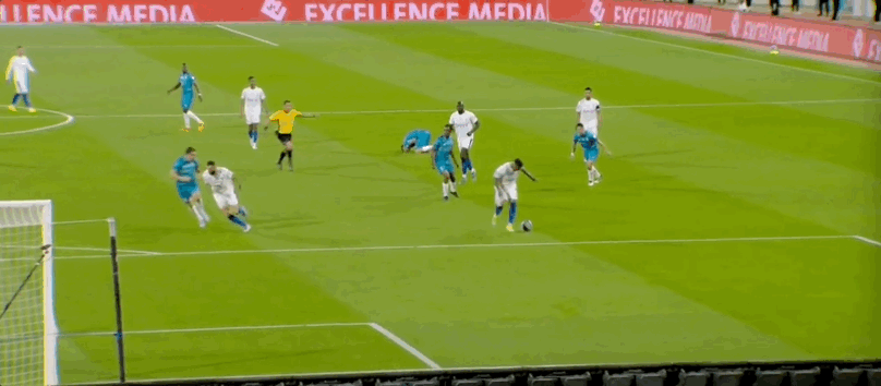 第64分钟,本泽马接多萨里传中,包抄破门,完成帽子戏法,将比分改写为3-0。