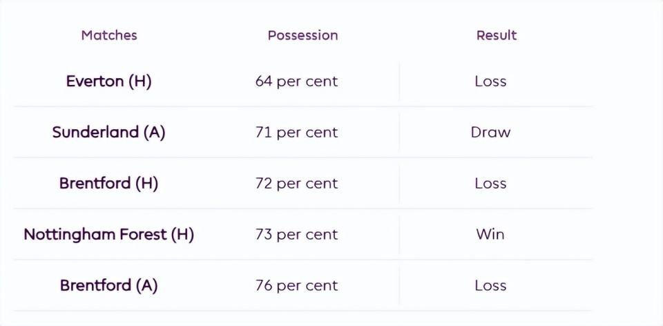 本赛季,只要对手选择深度防守、拒绝压迫,维拉就会陷入麻烦。他们在控球率超过60%的五场联赛中只赢过一场,其余分别输给了布伦特福德、埃弗顿和桑德兰。