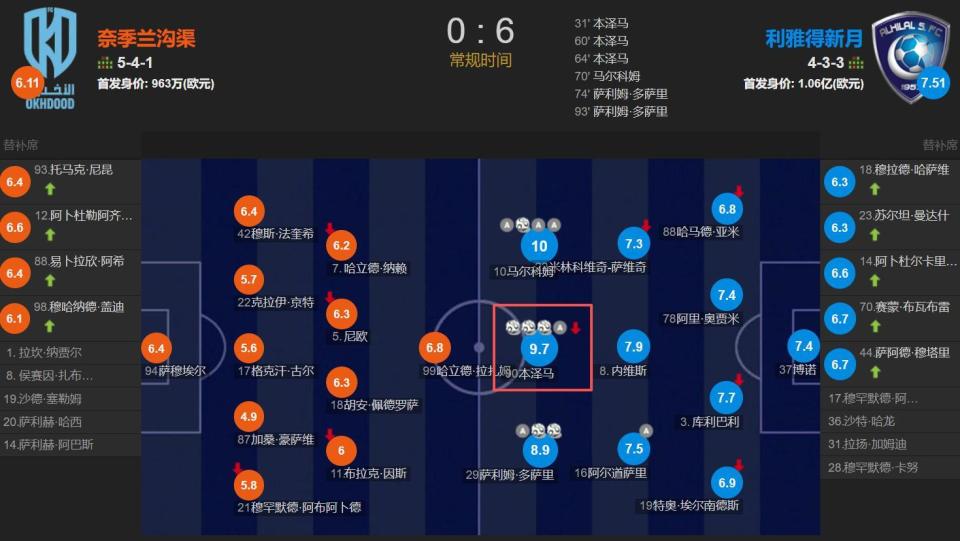 此役,本泽马打入了球队前3个进球,其中1球来自马尔科姆的助攻,本泽马也投桃报李,给马尔科姆送上了助攻。赛后,3射1助的本泽马获得了全场最高的9.7分,马尔科姆3助1射获得了满分-10分。可以说本泽马的到来,这位强力中锋的拿球策划和得分能力,彻底激活了利雅得新月的两个边路,左边锋S-多萨里2射1传,右边锋马尔科姆3射1传,这点是努涅斯完全不具备的能力,38岁的本泽马完全强于26岁的努涅斯。