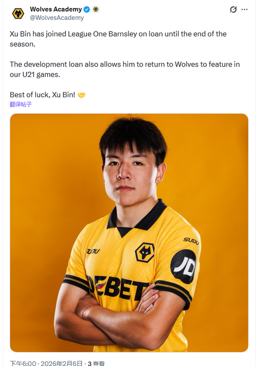 北京时间2月6日晚,英超狼队官方宣布,队内21岁的中国中场徐彬,正式租借加盟英甲球队巴恩斯利,租期至本赛季结束。