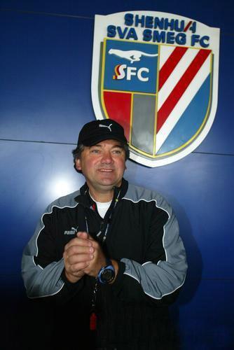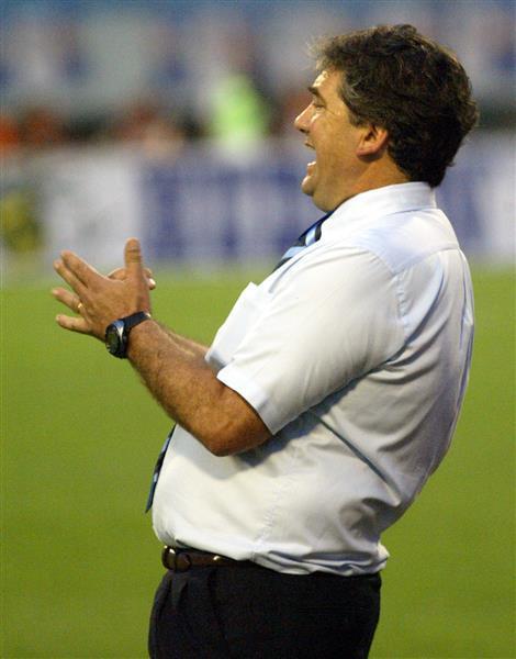 2007年6月7日,上海申花队主教练吉梅内斯在场边为球队鼓劲。当日,在山东济南进行的A3联赛揭幕战中,上海申花队以3比0战胜韩国联赛冠军城南一和队。 新华社发(刘力航摄)