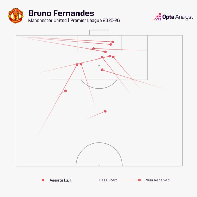 整个赛季,B费已经送出 12 次英超助攻,这是他单赛季的并列最高纪录(与 2020-21 赛季持平)。更夸张的是,他在本赛季前 7 场联赛中甚至没有任何助攻。