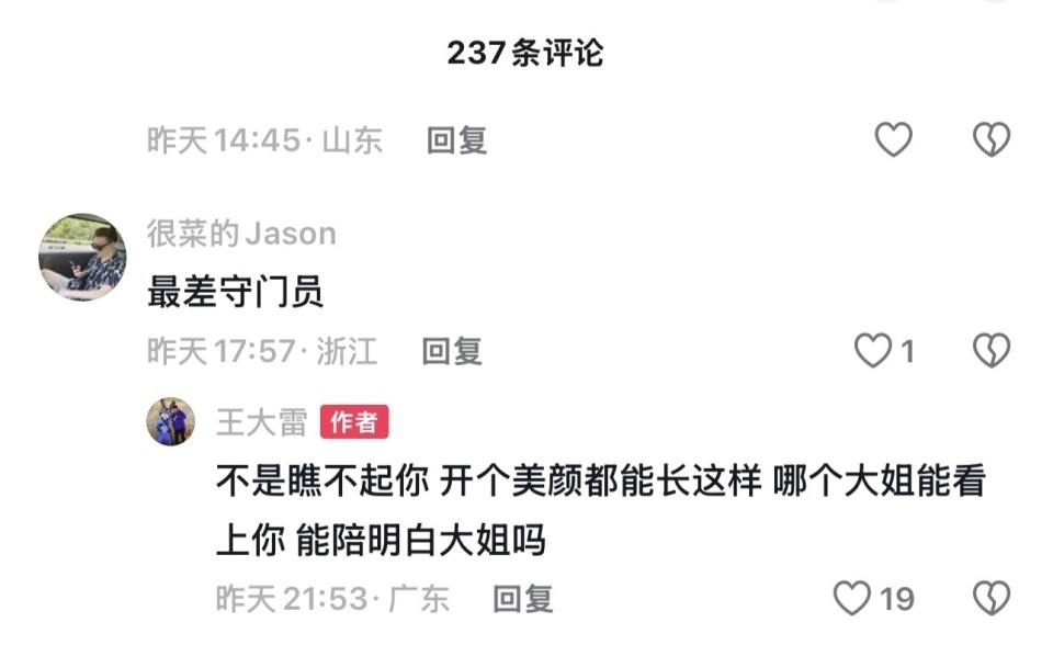 然而,有一名网友评论道:“最差守门员。”没想到王大雷本人直接回复:“不是瞧不起你,开个美颜都能长这样,哪个大姐能看上你,能陪明白大姐吗?”