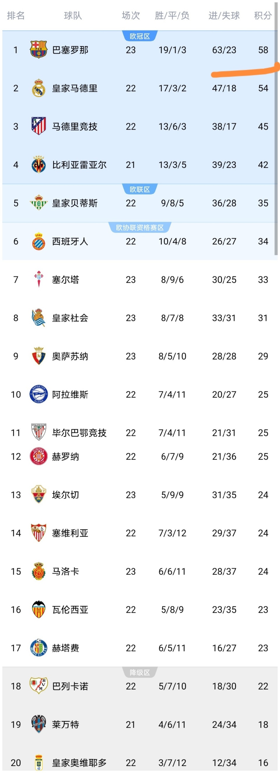 可以看到巴萨击败马略卡之后,积分上涨到了58分,已经拉开了皇马4分,如果本轮皇马输球,那么巴萨跟皇马的分差又将逐渐拉开,西甲争冠很是胶着啊。而马略卡输球之后,积分停留在了24分排名第15,马略卡仅领先降级区2分,保级形势很严峻啊。而皇家社会队主场击败埃尔切之后,积分上涨至了31分,皇家社会仅落后第6的西班牙人队3分,皇家社会有较大希望争夺到欧协联席位。