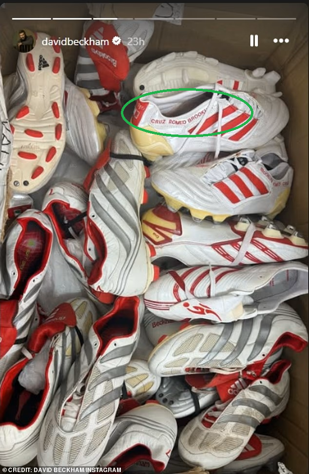 在一只鞋子上,贝克汉姆家三个男孩的名字清晰可见,布鲁克林、罗密欧以及克鲁兹。