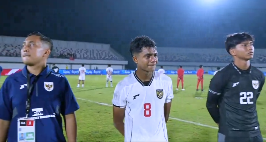 比赛结束之后,印尼U17球员、教练围在中圈面对看台。此时,多名印尼U17球员激动落泪,不断擦拭着泪水,而印尼主帅则面色铁青。