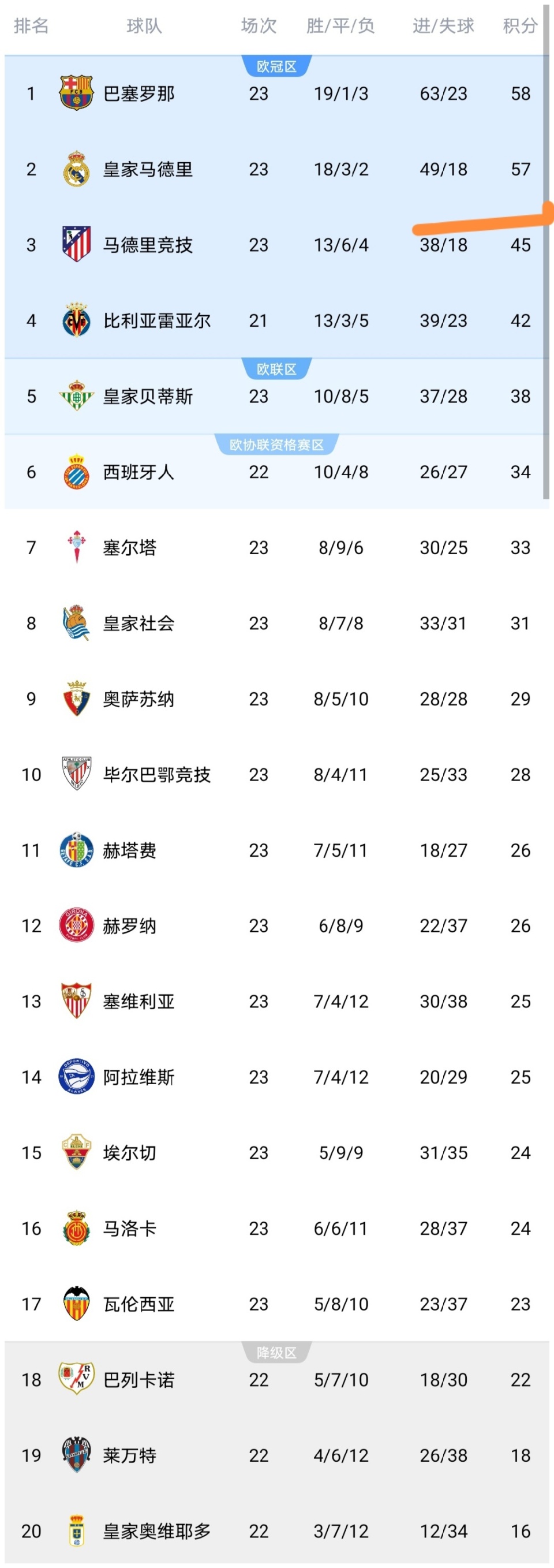 昨晚至今天凌晨,西甲第23轮结束5场较量,皇马、塞维利亚、马竞等队出战,这些比赛之后,西甲积分榜发生变化,我们来看看。