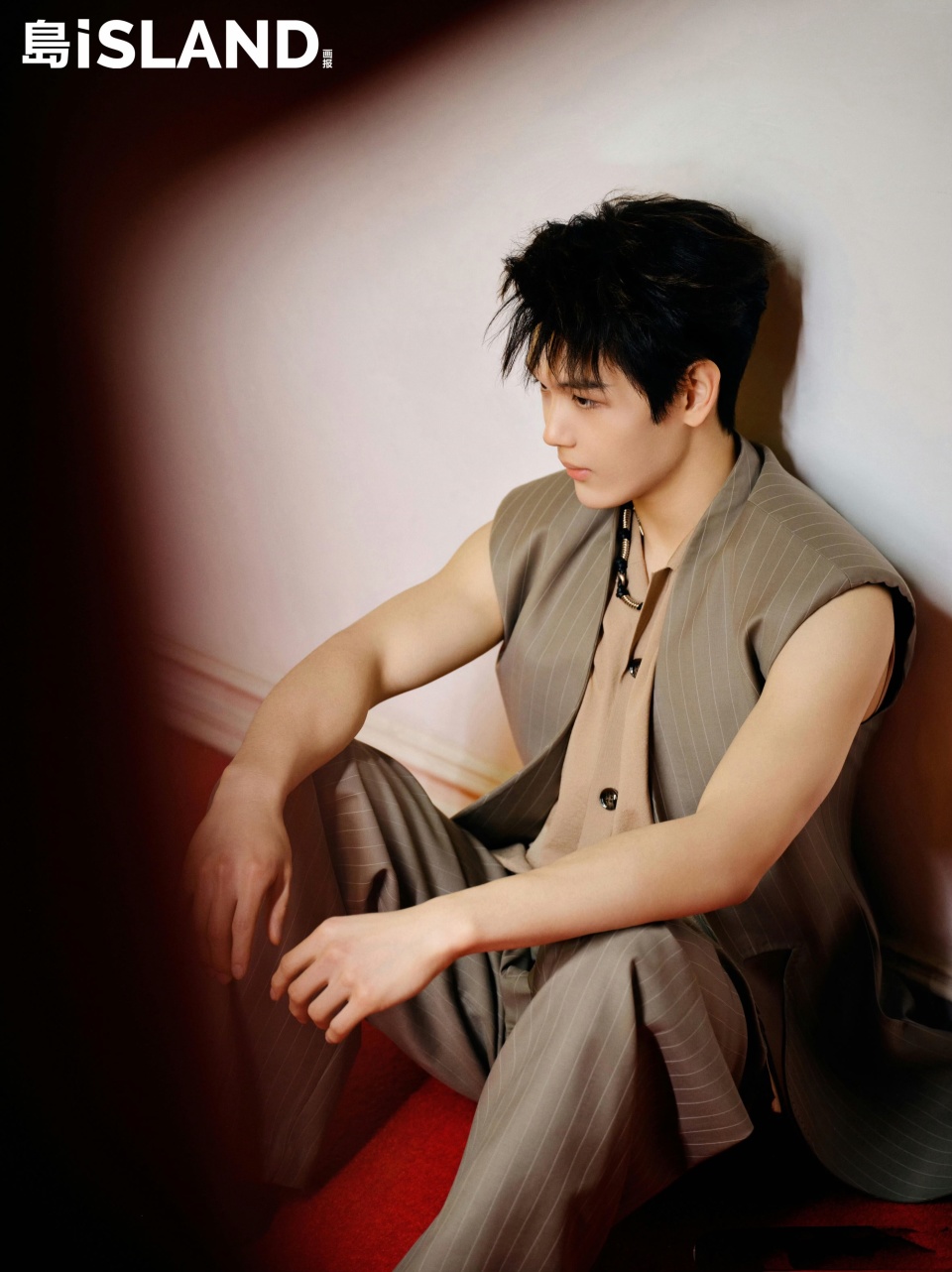 这组时尚大片中,还拍摄了很多王泓钦的个人镜头,他穿着条纹马甲、露出脖颈、手臂的线条,给人一种肌肉很结实的感觉。