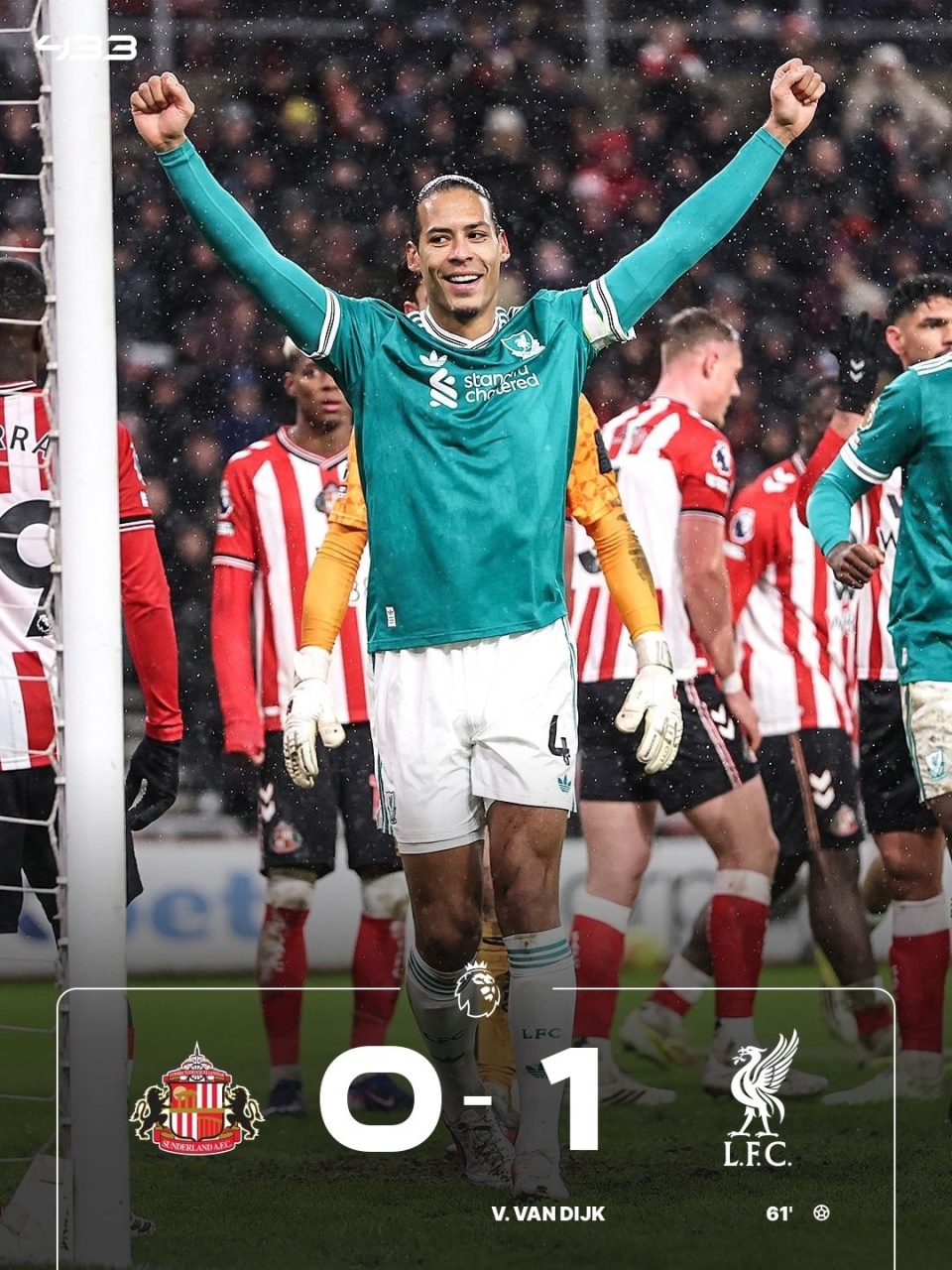 利物浦客场1-0战胜桑德兰,打破对手本赛季主场不败金身,积42分位居第6名,距离前四名3分。维尔茨中柱,范戴克头球打破僵局,萨拉赫角球助攻,远藤航伤退。