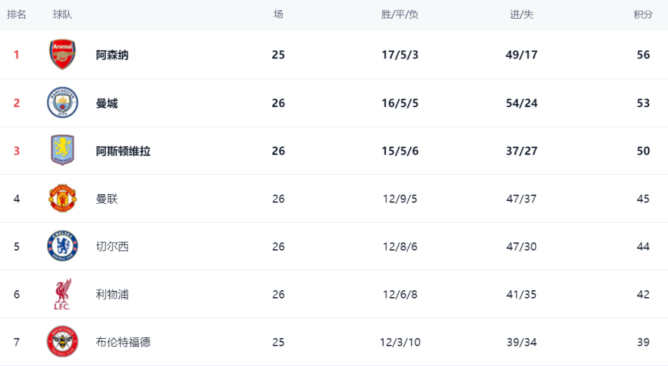 在积分榜上,阿森纳以56分高居榜首,战绩是17胜5平3负。曼城赢球之后,继续紧追阿森纳,只落后阿森纳3分,屈居第2。不过,曼城比阿森纳多踢1场。同样赢球的阿斯顿维拉拿到50分,排名第3,理论上依然有冲击冠军的希望。曼联45分排名第4。第5的切尔西拿到44分,仅仅落后曼联1分。利物浦赢球之后,总积分达到42分,排名第6,缩小与曼联切尔西的差距。争四的形势非常激烈,几支豪门的差距微乎其微。