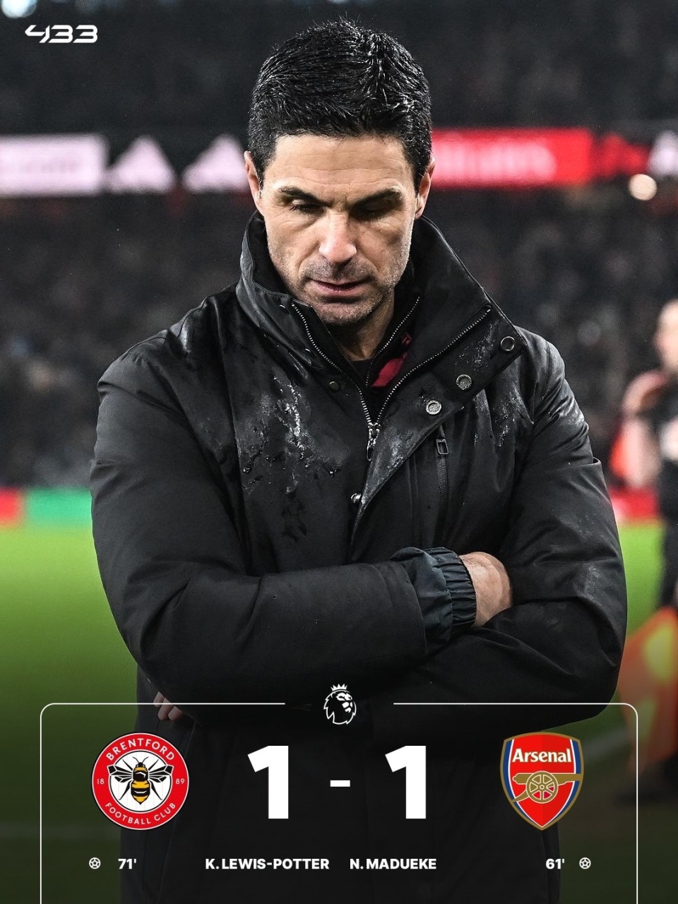 英超第26轮,阿森纳客场1-1战平布伦特福德,领先4分。拉亚险些送礼+神扑救主,马杜埃凯下半场打破僵局,刘易斯-波特扳平,马丁内利补时失单刀。