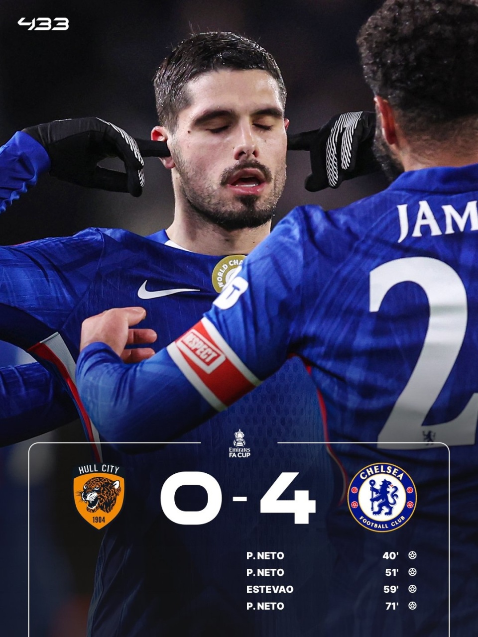 足总杯第4轮,切尔西客场4-0大胜赫尔城,晋级16强。内托角球直接破门+上演帽子戏法,德拉普助攻戴帽,埃斯特旺破门。