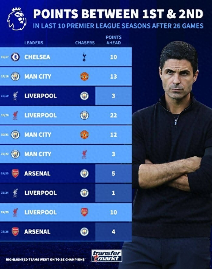 对此,德转盘点了近10个赛季英超26轮战罢榜首前二名球队的积分差距,其中高亮部分的榜首球队最终夺冠,而发生榜首丢冠的次数共有3次,就包括2022-23赛季阿森纳5分领先于曼城,而最终阿森纳丢冠。