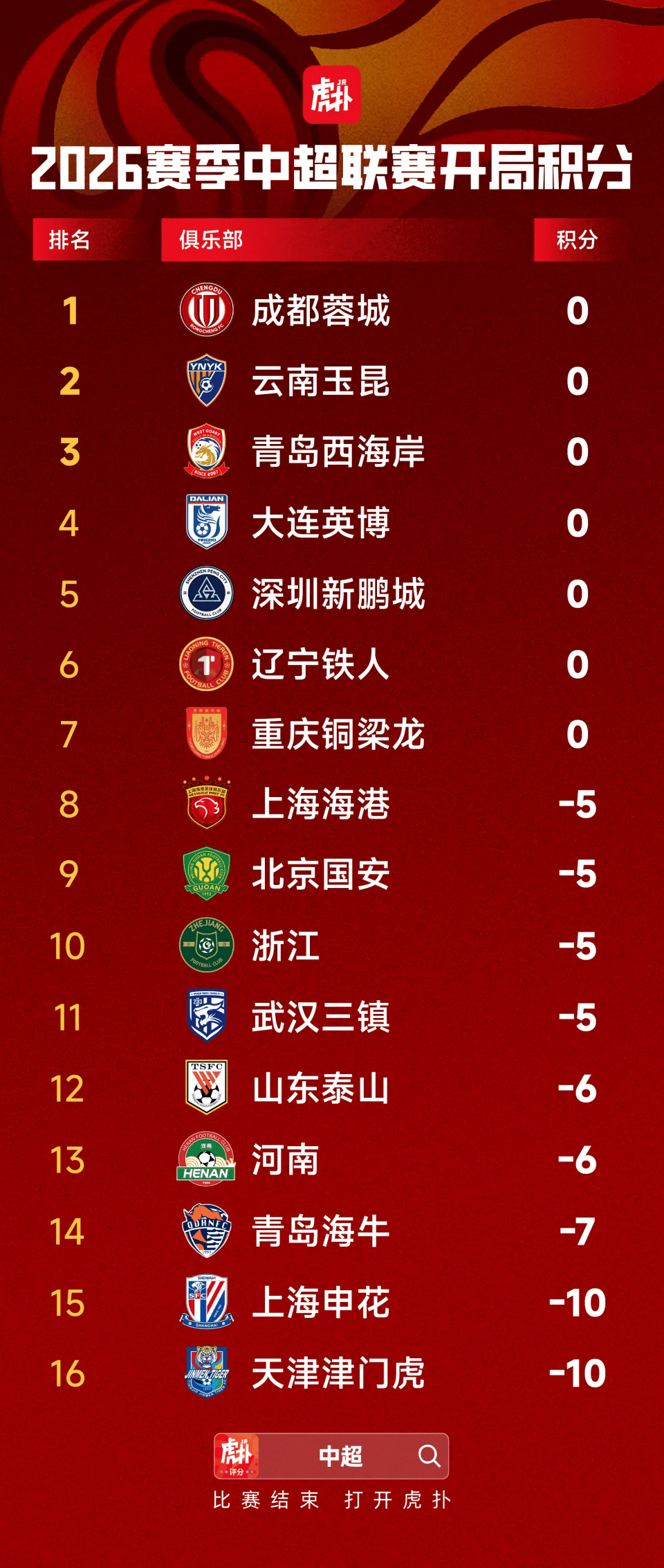 虎扑02月14日讯 中足联官方公布了2026赛季中超联赛赛程。新赛季中超将于3月6日揭幕,11月8日收官;揭幕战为成都蓉城vs深圳新鹏城,开幕式在凤凰山球场进行。