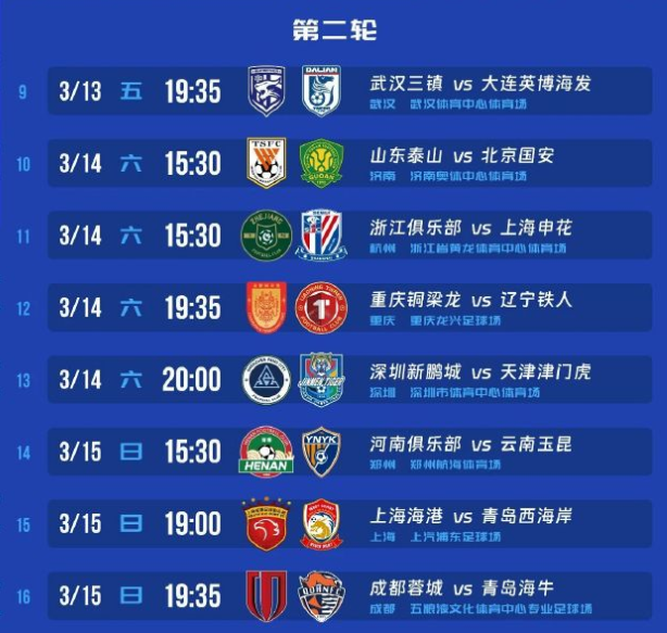作为卫冕冠军,上海海港将在第5、第6轮分别客场对阵上海申花、山东泰山。值得一提的是,上海海港上半程将客场对阵申花、泰山、国安、蓉城这四支争冠球队。