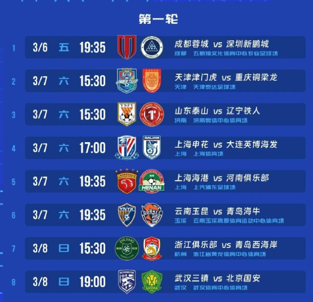 3月6日,中超揭幕战将在成都进行,成都蓉城将主场对阵深圳新鹏城,首次为成都蓉城出场的拜合拉木就将对阵老东家。辽宁铁人、重庆铜梁龙分别客场对阵山东泰山、天津津门虎,这将是两支球队的中超处子秀。