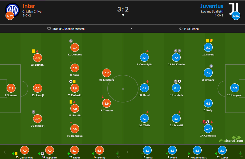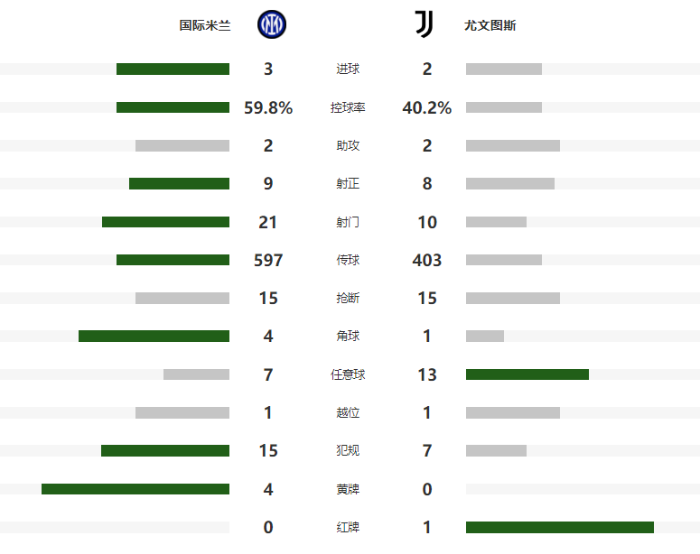 本场比赛尤文后卫坎比亚索上半场另类双响,送出乌龙后又扳平比分,随后卡卢卢染红离场,让国米取得了人数上的优势,下半场替补登场的皮奥头球建功,让蓝黑军团再次取得领先,但洛卡特利的进球让尤文看到了拿分的希望,不过最后时刻泽林斯基打入绝杀,帮助国米3-2险胜尤文。