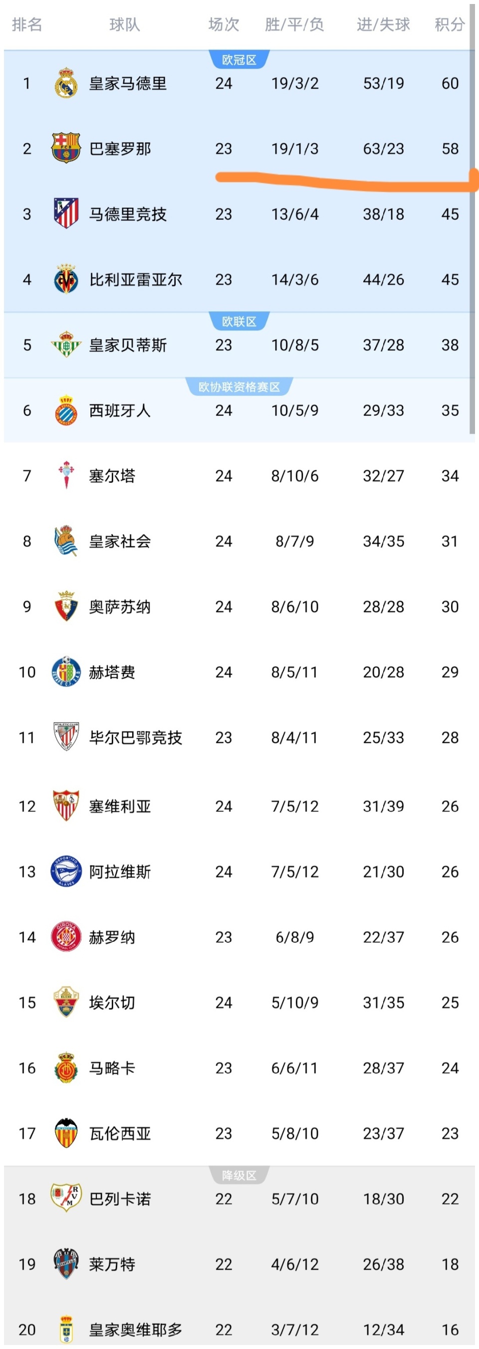 可以看到皇马主场大胜皇家社会队之后,积分上涨到了60分,暂时反超巴萨升至西甲榜首,可以看到巴萨已经丢了榜首,巴萨能不能再次回到榜首位置我们不得而知,如果本轮巴萨获胜他们可以重新回到榜首,如果本轮巴萨不胜,那么巴萨就无法回到榜首位置。而皇家社会队输球之后,积31分继续排名第8。比利亚雷亚尔队输球之后积45分继续排名第4,无缘反超马竞升至第3。